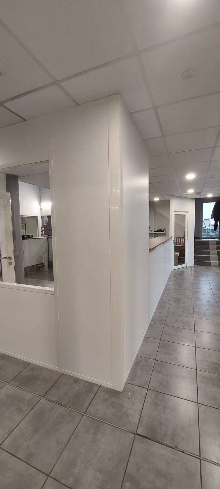 Le reste de l’aménagement comprend des cloisons aluminium pleines et vitrées sur allège, offrant un bon équilibre entre confidentialité et luminosité naturelle. L’ensemble est complété par une porte d’accès vitrée, facilitant la circulation et renforçant la cohérence visuelle de l’installation.