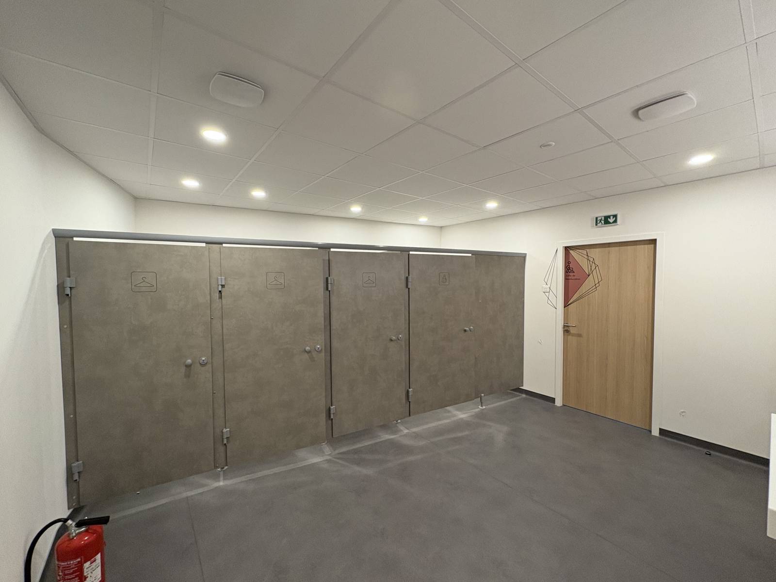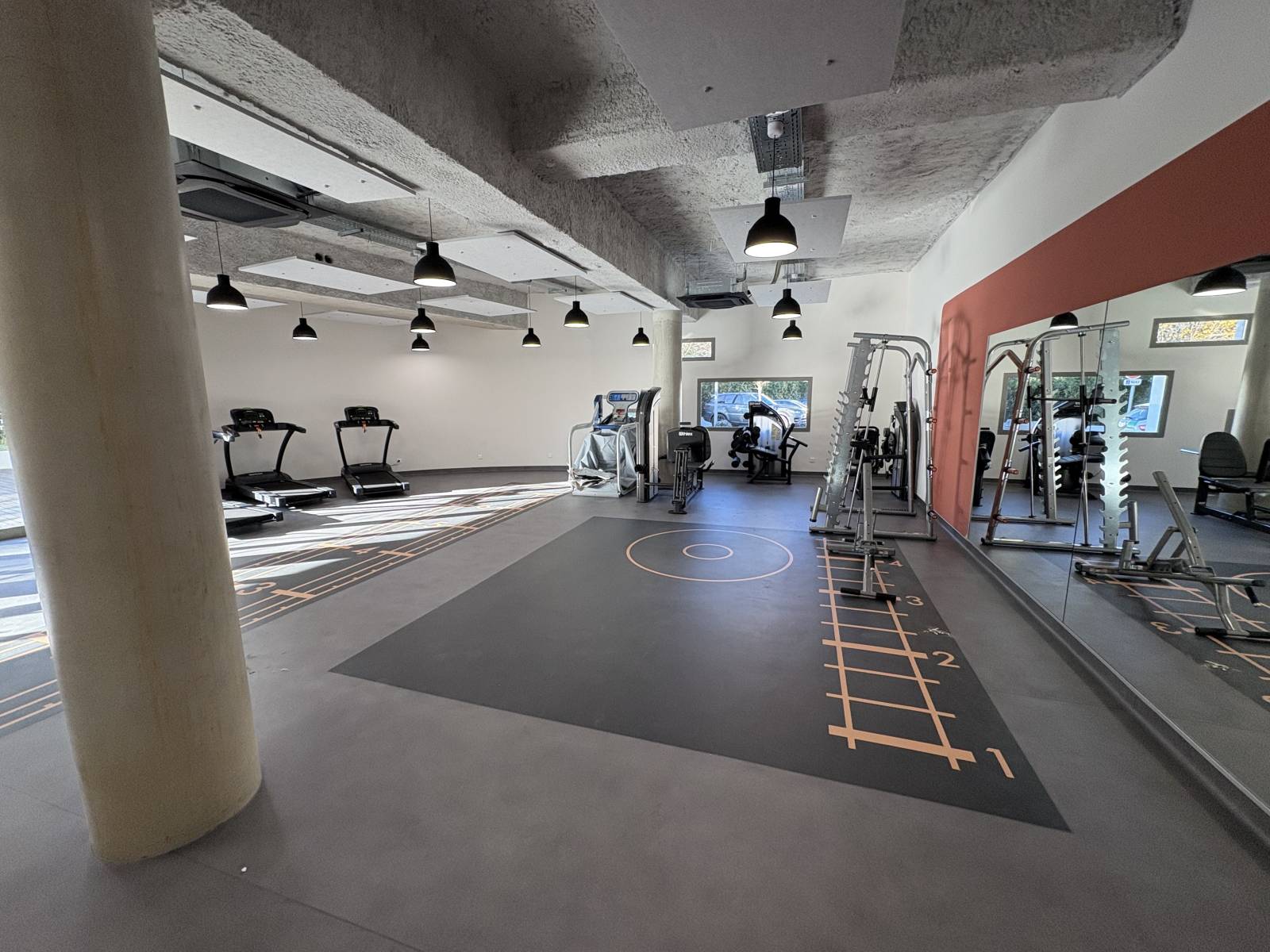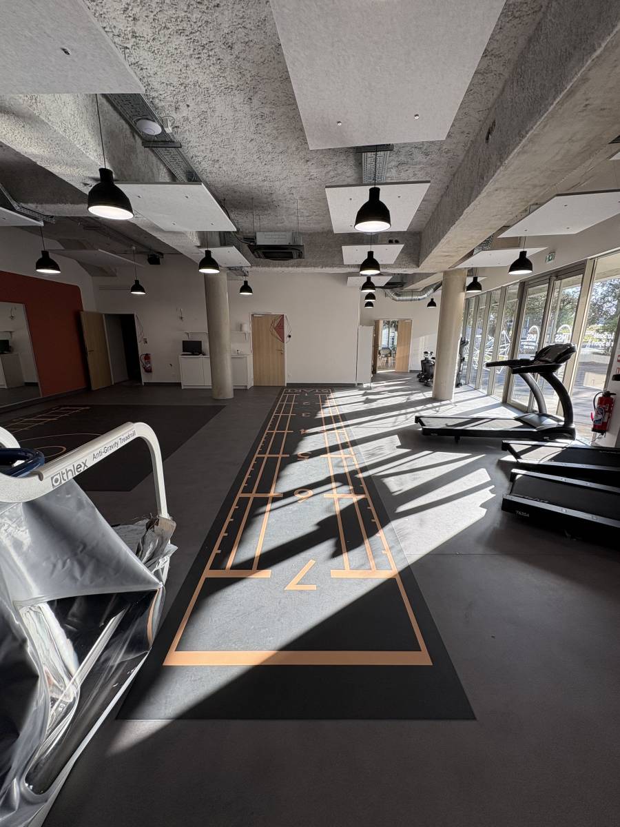 Pour la salle de rééducation sportive et les vestiaires, nous avons mis en œuvre un sol souple PVC en lès, un choix idéal pour sa résilience et son confort d'usage intensif. Le revêtement principal arbore un élégant gris clair, apportant luminosité et modernité à l'espace. Pour les exercices spécifiques, nous avons intégré deux lès sur mesure d'un gris plus foncé, équipés d'échelles graduées de couleur orange. Cette innovation facilite la précision des mouvements et la progression des patients. La remontée de plinthe périphérique assure une finition impeccable et une hygiène optimale, essentielle dans un environnement médical. La pose d'un sol souple PVC technique est un de nos domaine d'expertise.