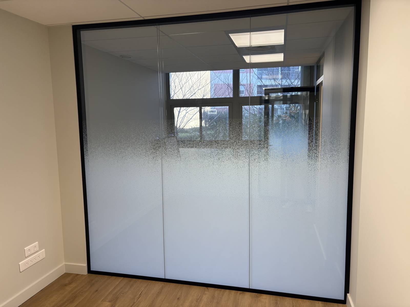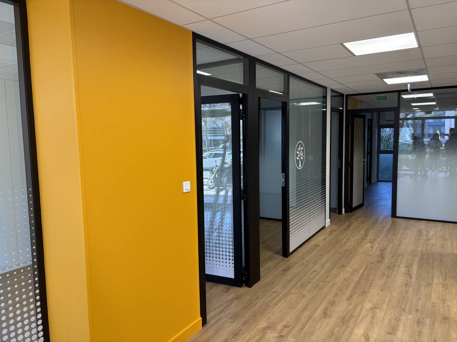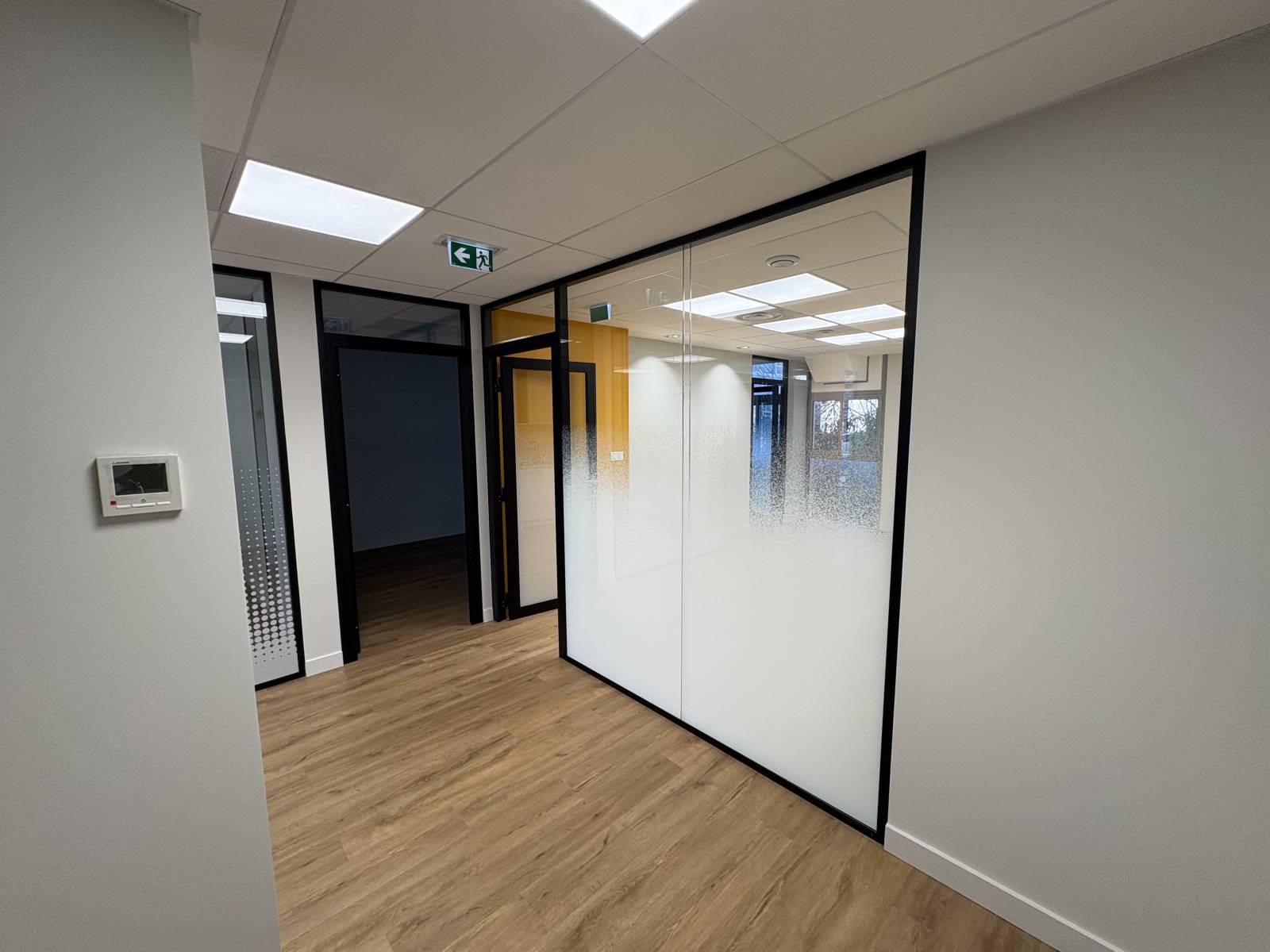 Les cloisons amovibles vitrées installées sont des cloisons toute hauteur, bord à bord, en double vitrage clair avec une ossature aluminium finition noir mat. Elles délimitent les différents bureaux et la salle de réunion tout en garantissant une forte isolation phonique. L’intégration de portes en aluminium vitrées double vitrage, assorties à l’ensemble, renforce la cohérence visuelle et fonctionnelle des cloisons amovibles.