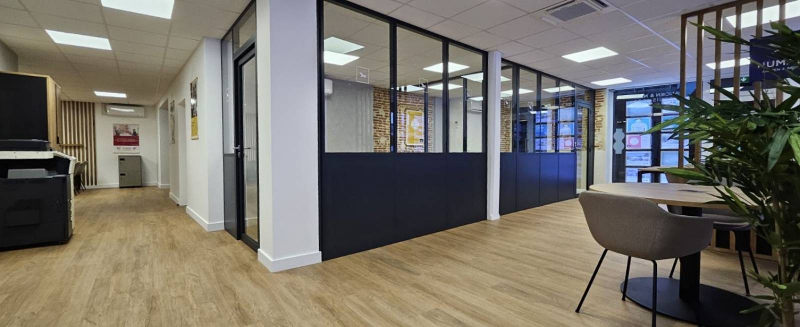 La pose de sol souple type PVC en imitation parquet a été réalisée pour apporter une cohérence et un aspect contemporain à l'ensemble, créant ainsi une atmosphère chaleureuse et professionnelle.